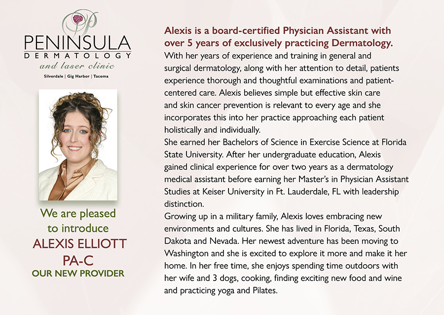 Peninsula Dermatology Laser Clinic & Spa is committed to providing the most excellent and comprehensive general dermatological, surgical dermatological and cosmetic dermatological care in Northern Pierce and Kitsap counties. We provide a patient centered focus, offering a complete broad spectrum of dermatological services, we strive for 5 star patient care and take pride in enriching the lives of those we serve.